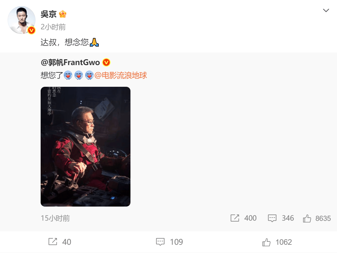 2月27日,吴孟达去世五周年,郭帆上传《流浪地球》剧照并写下“想您了”三个字。之后吴京转发配文“达叔短线配资炒股网,想念您。”