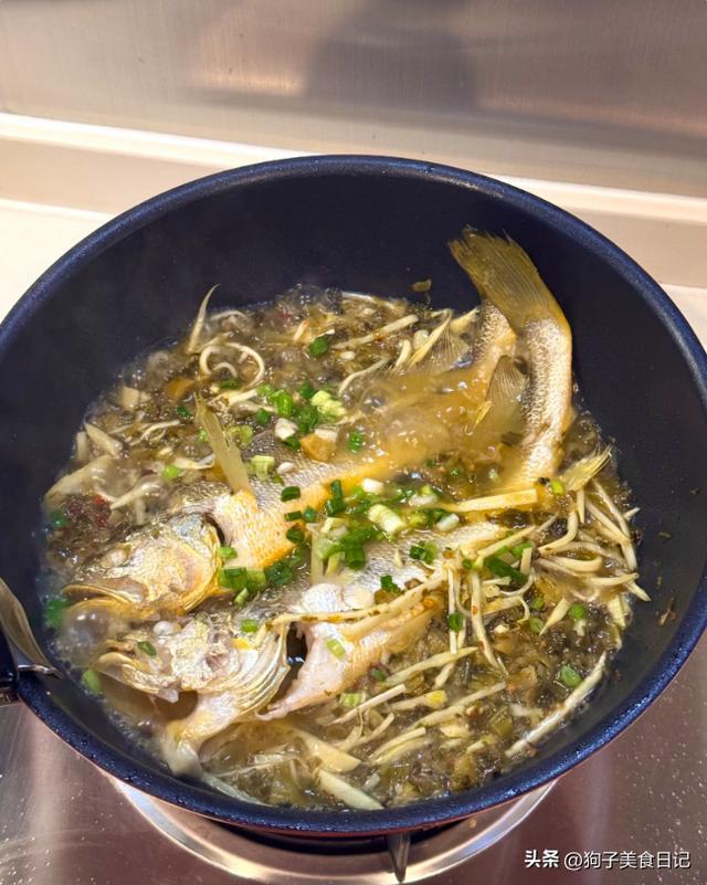 食材: 大黄花鱼1条、雪菜(雪里蕻)切末、春笋切丝、姜片、猪油。
