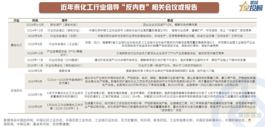 本轮周期的最大动能,源于供给侧从政策约束到市场出清的演绎,反内卷已成为重塑化工行业竞争格局的关键词。2025年以来政策持续推进,具体措施包括收紧新项目审批、淘汰高耗能落后产能、并推动PTA、农药、有机硅等子行业形成自律共识,对低质量、同质化的无序竞争形成约束。