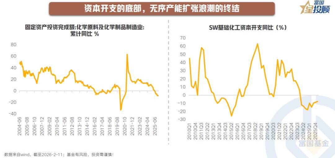 历经近四年的调整,化工行业已呈现出典型的周期底部特征。首先,资本开支的底部,标志着上一轮无序产能扩张浪潮的终结。行业固定资产投资额自2025年中开始转负,2025年Q3资本开支同比下滑10%,且自2024年以来连续多季度负增长,扩产意愿降至冰点。