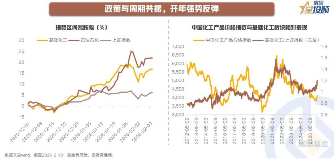 2025年底以来,化工板块迎来修复行情。2025/12/17-2026/2/10,基础化工上涨21%,石油石化上涨25%,涨幅在申万31个一级行业中排名第6和第4。2026年作为“十五五”规划的开局之年,或将成为化工行业迎来高质量发展新周期的关键转折点,而核心破局动力,来自政策与市场周期的共振。
