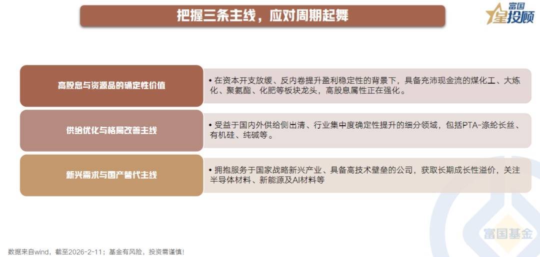 基于周期反转与成长牵引,化工板块可沿三条主线布局。1)关注高股息、现金流充沛的资源品龙头;2)布局供给出清、格局改善的细分领域;2)新兴需求与国产替代主线,聚焦半导体、新能源、AI材料等高壁垒赛道,把握长期成长机遇。