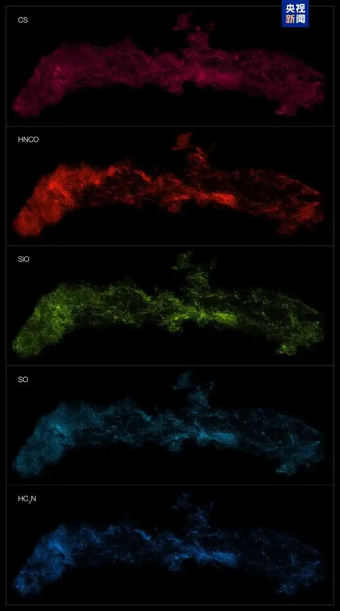 △ALMA观测到的银河系中心不同分子分布,此处展示的五种分子自上而下分别为:一硫化碳、异氰酸、一氧化硅、一氧化硫和氰乙炔。