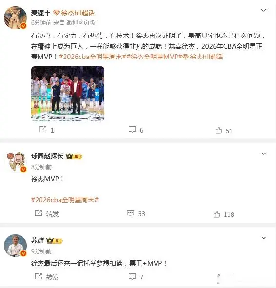 媒体人“麦穗丰”发文点评:有决心,有实力,有热情,有技术!徐杰再次证明了,身高其实也不是什么问题,在精神上成为巨人,一样能够获得非凡的成就!恭喜徐杰,2026年CBA全明星正赛MVP!